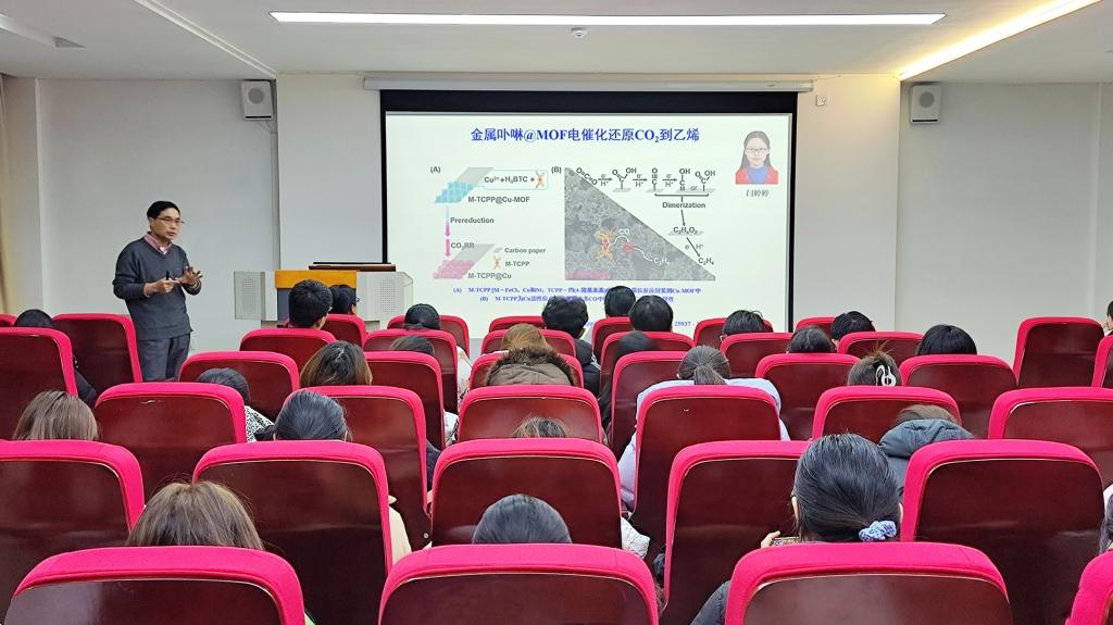 报告会上,孙为银教授结合自己及团队多年研究成果,为大家做了题为《金属有机框架及其复合材料的创制和催化 二氧化碳转化活性和选择性调控》的报告,他深入浅出地为同学们讲解了配位化学的相关知识,介绍了团队成员关于MOFs与CO转化的光催化及电催化方式的研究项目。在提问环节,参加讲座的老师和同学积极与孙为银教授进行面对面探讨,孙教授耐心解答,并鼓励大家在今后的科研过程中能够发扬勇于探索、不屈不挠的精神。