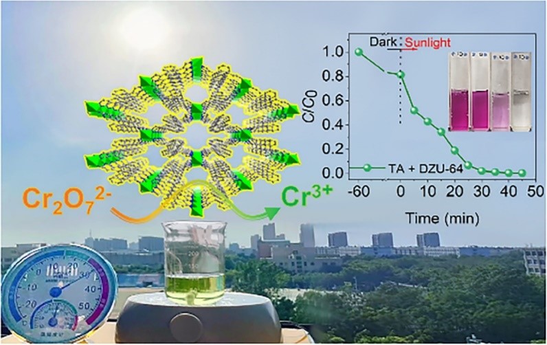 纺织工业印染废水中的重金属铬(Cr(VI))毒性大,对水环境和生态系统具有极大的危害性。因此,消除废水中的铬(VI)污染物至关重要。金属有机框架(MOF)是一类新型分子基多孔材料,由于其结构和性能可在分子水平设计和构建,因此在先进功能材料的研发中备受关注。基于前期材料合成积累和学科交叉交流,团队设计合成一种新型MOF光催化剂,实现绿色消除废水中的Cr(VI)污染。通过在模拟阳光和真实太阳光下的多重测试,证实了其高效的去除性能,并且通过理论计算揭示了该光催化转化过程的机理。该工作创制的MOF材料和应用成果已申请国家发明专利并获授权。这项工作可为新型光催化剂的开发提供有效借鉴,同时为推进MOF在消除工业废水中的应用提供新材料支撑。