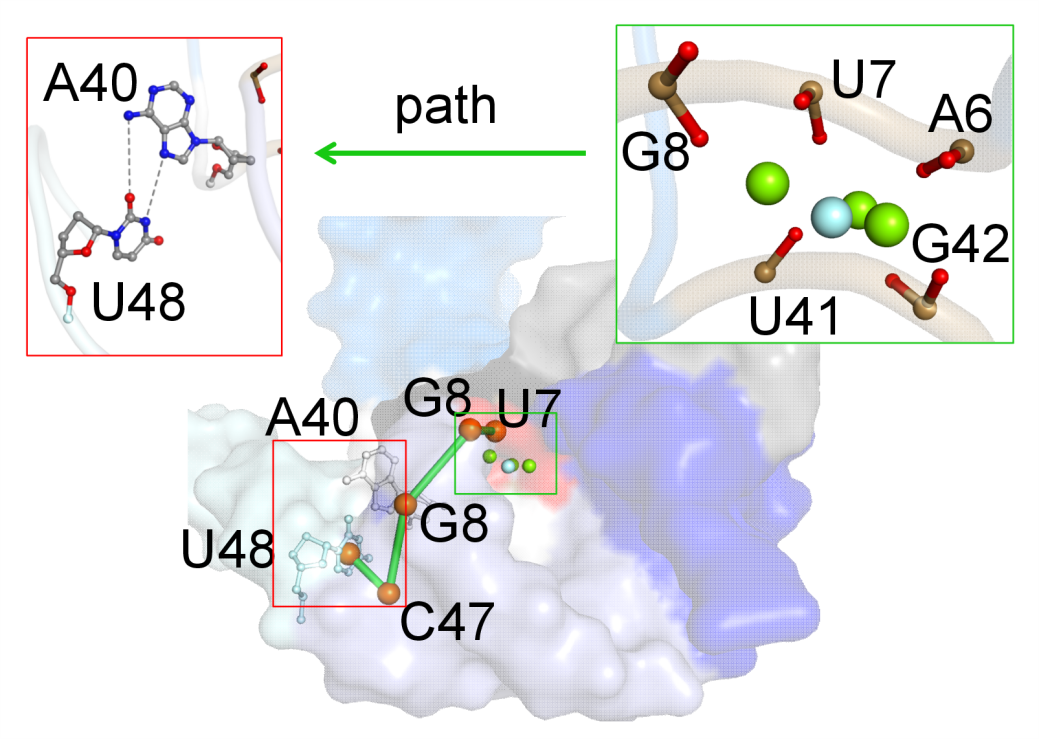 核糖开关通过与特定的小分子或离子结合实现调控信息的传递,进而调节下游基因的表达。在一类氟核糖开关中,转录终止信号由瞬态激发态(ES)传递。我们采用分子动力学(MD)模拟的方法,计算出实验结构难以观察到的激发态结构。通过机器学习的方法研究氟化物核开关适配体内结合的信息传递机制。