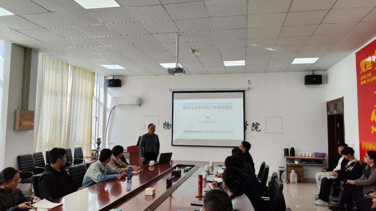 李成教授以《星系生态系统的三条演化路径》为题向与会人员作学术报告,介绍了标准宇宙学模型的发展历史;结合二十一世纪以来大规模宇宙学数值模拟的实现以及大型图像和光谱巡天的实施,高屋建瓴地总结了星系的观测和理论研究所取得的研究成就;展望了展望该领域尚待解决的关键问题。李教授同与会师生就报告内容进行了深入交流。