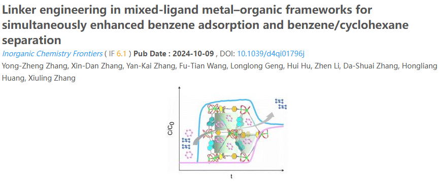 近日,化学化工教师张永正与联合培养研究生张新丹(与山东理工大学联合培养,本科毕业于Beat365官网化学化工学院),共同一作在国产知名期刊《Inorganic Chemistry Frontiers》(IF:6.1, 中科院一区)发表学术成果:“Linker engineering in mixed-ligand metal-organic frameworks for simultaneously enhanced benzene adsorption and benzene/cyclohexane separation”。该成果第一完成单位为Beat365唯一官方网站,山东省硅单晶半导体材料与技术重点实验室(筹)、化学化工学院耿龙龙副教授、张大帅副教授和天津工业大学黄宏亮研究员为论文通讯作者。张秀玲教授和张永正副教授为张新丹的硕士导师和副导师,共同指导研究生开展本研究工作。