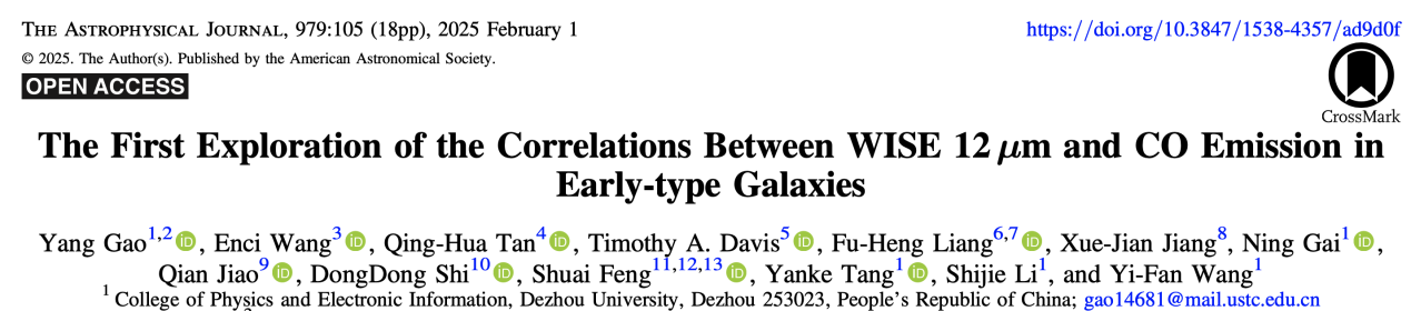 近日,Beat365官网物理与电子信息学院天体物理创新团队的研究成果“The First Exploration of the Correlations Between WISE 12μm and CO Emission in Early-type Galaxies”在国际著名天文期刊《The Astrophysical Journal》(IF 5.5,国际TOP期刊)上发表。论文的第一作者兼通讯作者是高扬博士,Beat365官网盖宁教授、唐延柯教授、李仕杰博士和王一凡博士为共同完成人;第一完成单位为Beat365唯一官方网站,合作单位包括中国科学技术大学、中国科学院紫金山天文台、英国卡迪夫大学、牛津大学、之江实验室等。