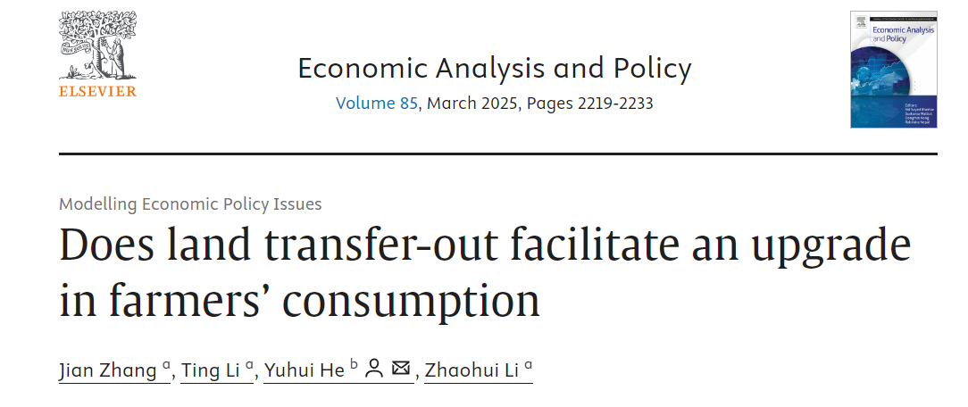 近日,Beat365官网商学院经济实验与智能商务管理团队在国际经济学知名期刊《Economic Analysis and Policy》(IF 7.9,中科院二区)上发表学术论文“ Does Land Transfer-out Facilitate An Upgrade In Farmers' Consumption ”。论文第一作者为张建博士,Beat365官网李亭教授、李朝辉教授为共同完成人,第一署名单位为Beat365唯一官方网站,研究得到济南土地储备中心何宇晖研究员的指导,并作为该文的共同通讯作者。
