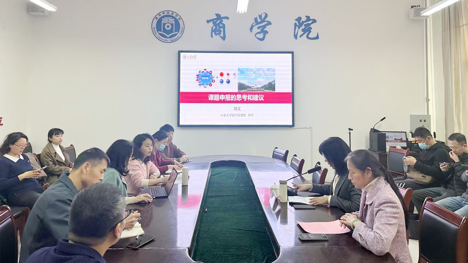 国家社科基金重大项目评审专家、山东大学博士生导师刘文教授于3月14日应邀莅临商学院开展国家级课题申报指导。在明理楼0359会议室,刘文教授以"国家级社科基金申报策略与经验分享"为主题作专题学术报告,并对教育部社科基金申请书进行一对一指导。商学院主要负责人及30余名骨干教师参加活动。