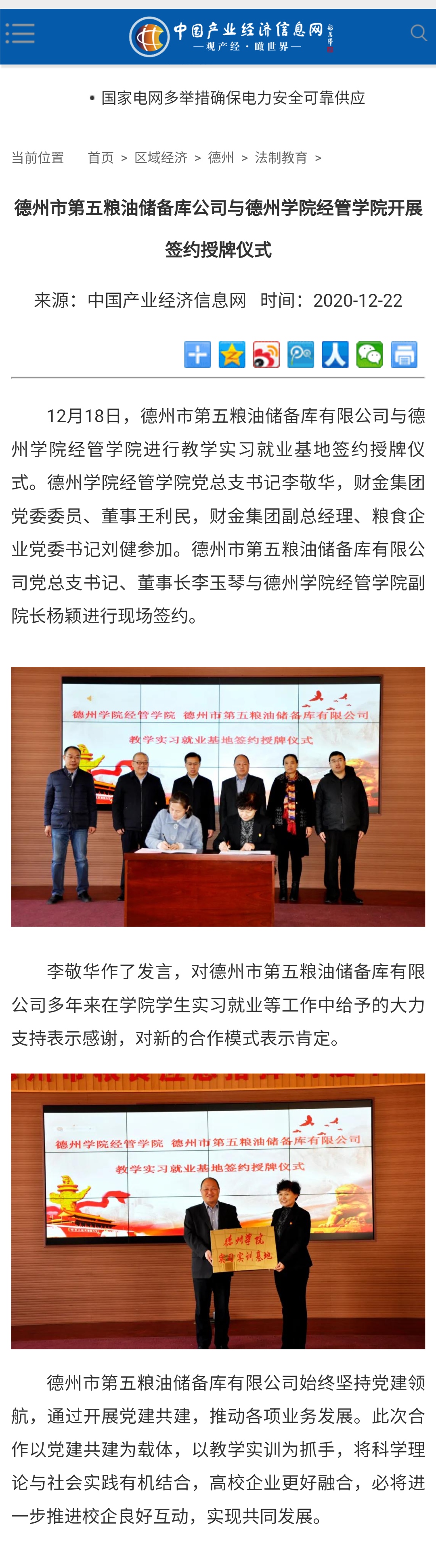 【中国产业经济信息网】德州市第五粮油储备库公司与Beat365唯一官方网站经管学院开展签约授牌仪式