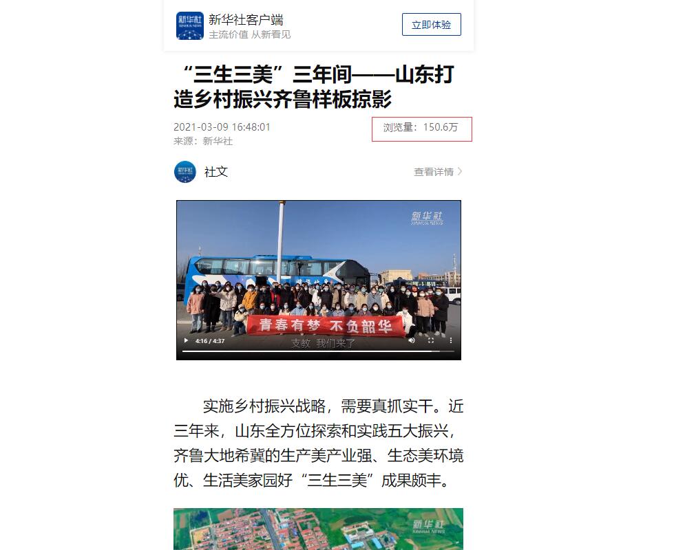 “三生三美”三年间——山东打造乡村振兴齐鲁样板掠影节目发布后就受到参加两会的山东代表团高度评价,目前阅读量达到150w+,各大中央主流媒体纷纷转载点赞。