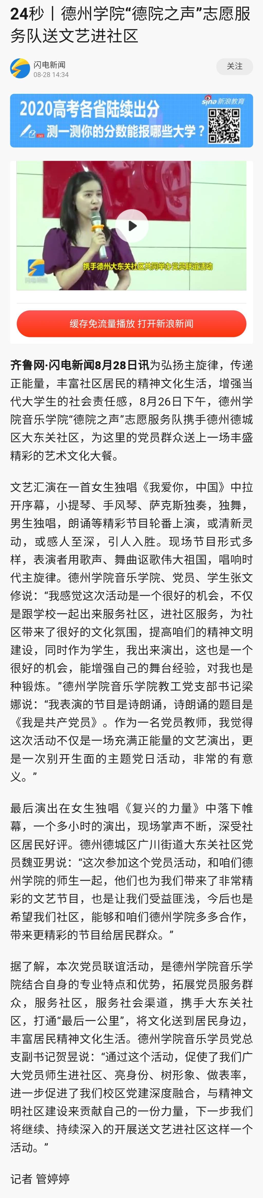 【新浪网、齐鲁网、德州电视台】24秒丨Beat365唯一官方网站“德院之声”志愿服务队送文艺进社区