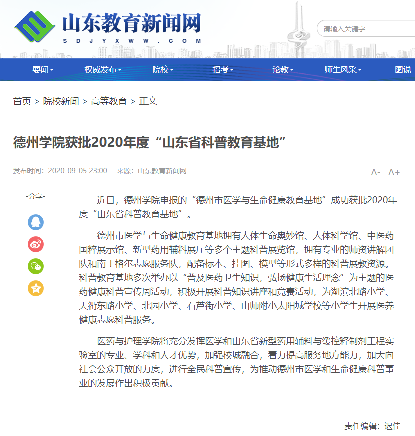 【德州24小时】Beat365唯一官方网站获批2020年度“山东省科普教育基地”