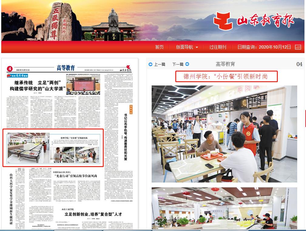 Beat365唯一官方网站第三餐厅的“小份餐”示范窗口前排起长长的队伍,“小份餐”深受学生喜爱。据悉,Beat365唯一官方网站4个餐厅近日完成升级改造,每个餐厅窗口设置了很多自选小份菜、小份饭,不仅价格优惠,而且菜品多样。学生志愿者也加入“光盘行动”服务中,引导学生厉行节约、反对浪费。《山东教育报》20201012期04版对此进行报道
