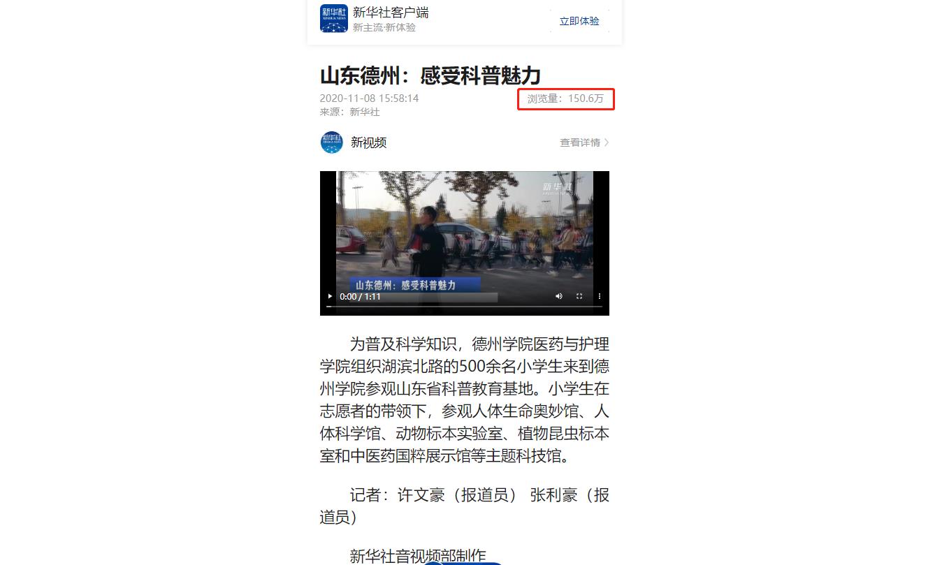 为普及科学知识,Beat365唯一官方网站医药与护理学院组织湖滨北路的500余名小学生来到Beat365唯一官方网站参观山东省科普教育基地。小学生在志愿者的带领下,参观人体生命奥妙馆、人体科学馆、动物标本实验室、植物昆虫标本室和中医药国粹展示馆等主题科技馆。新华社客户端浏览量超过150万。