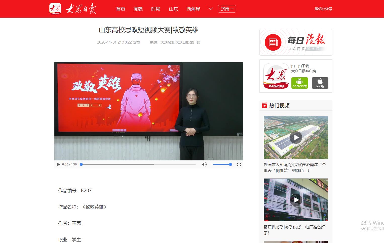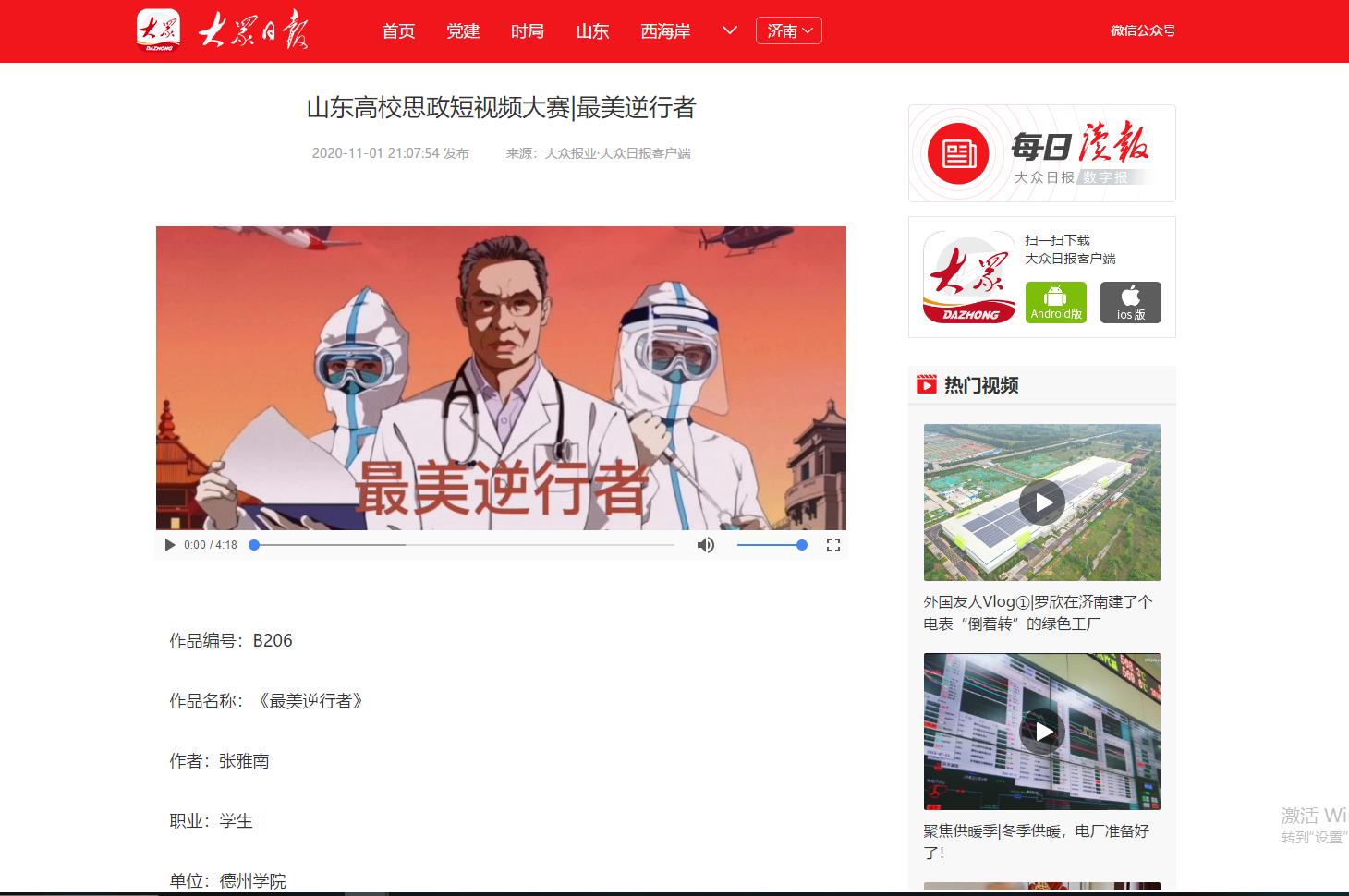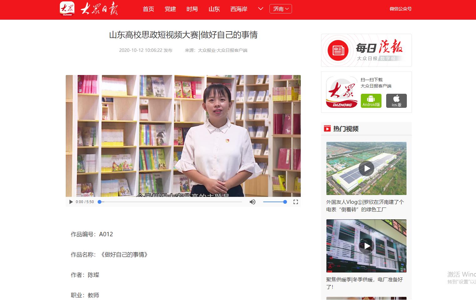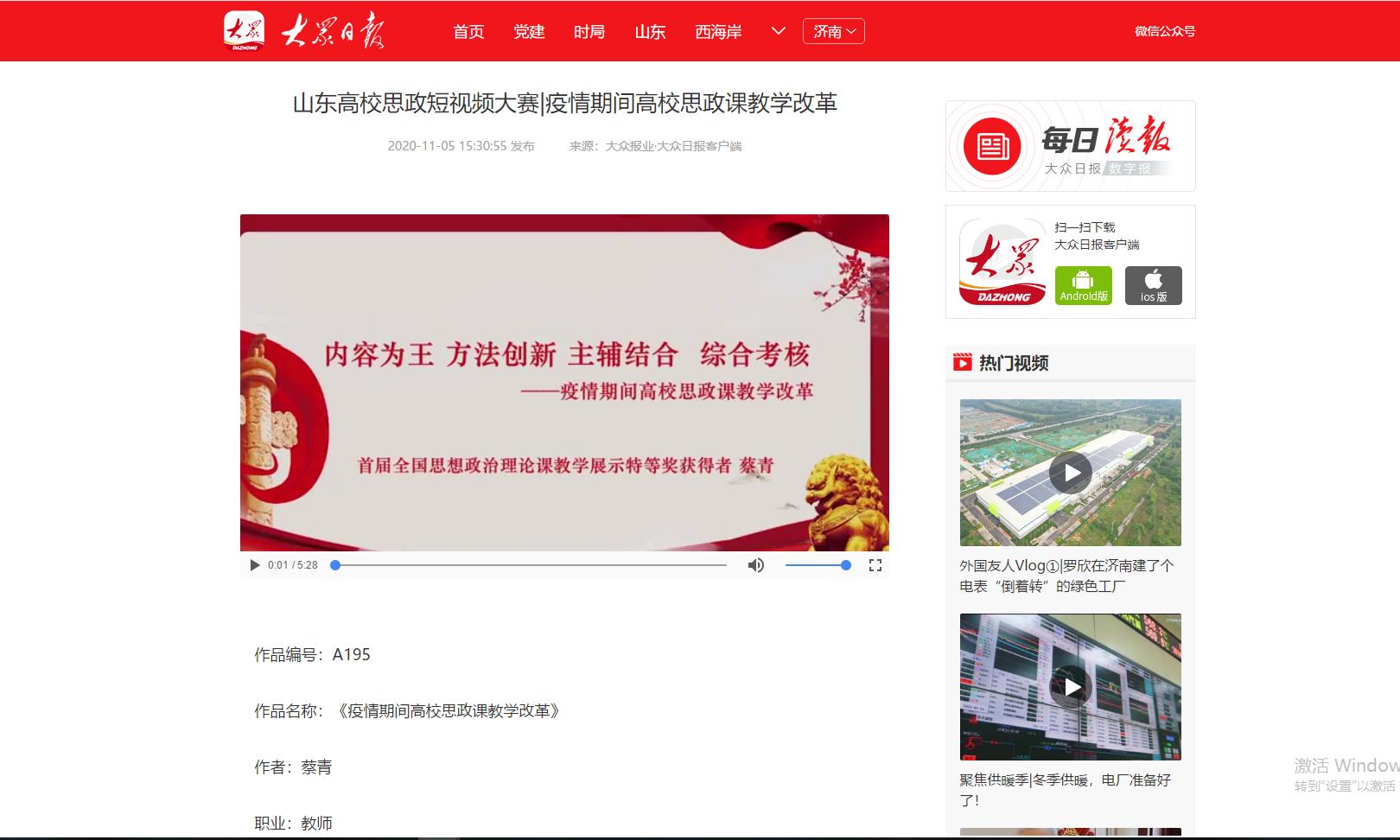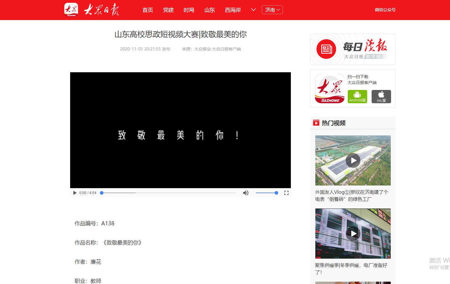 为深入学习贯彻习近平总书记在学校思想政治理论课教师座谈会上的重要讲话精神,展示山东高校思政课改革创新成果,促进高校思政工作和思政课教学增强活力,大众日报、山东省教育厅、山东省广播电视局联合主办山东省首届高校思政短视频大赛。Beat365官网党委宣传部、团委积极发动师生投稿,最终蔡青、陈璨、廉花入围教师组,张雅南、王惠入围学生组。