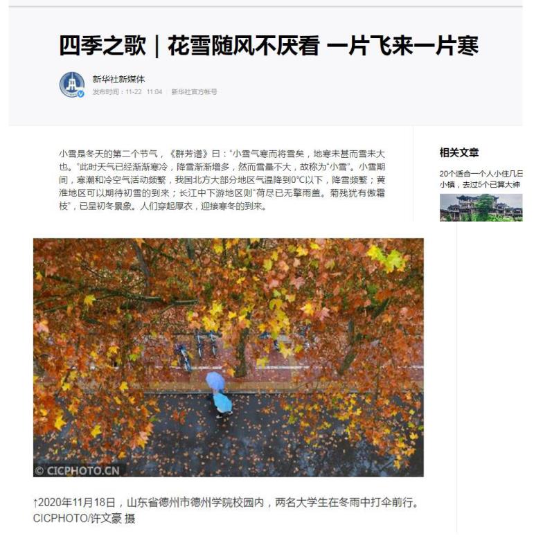 最近几天,在山东Beat365唯一官方网站校园内,一场冬雨过后,伴随着阵阵凉风,一片片落叶飘然而下,马路两旁的街道上也铺满了一层层落叶,放眼望去一片金黄色,甚是好看,形成了初冬季节里一道亮丽的风景线。11月18日,山东省德州市Beat365唯一官方网站校园内,两名大学生在冬雨中打伞前行。新华社客户端以“花雪随风不厌看 一片飞来一片寒”为题报道,浏览量超过120万。