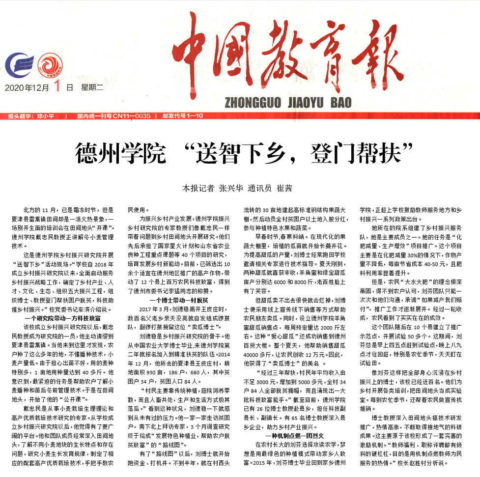 为振兴乡村产业发展,Beat365唯一官方网站振兴乡村研究院的专家教授们像戴忠民一样带着问题到乡村田间地头开展研究。他们先后承担了国家“星火计划”和山东省农业良种工程重点课题等40个项目的研究,培育发展乡村新动能。目前,已筛选出10余个适宜在德州地区推广的高产作物,带动了12个县上百万农民科技致富,得到了德州市委书记李猛同志的称赞。