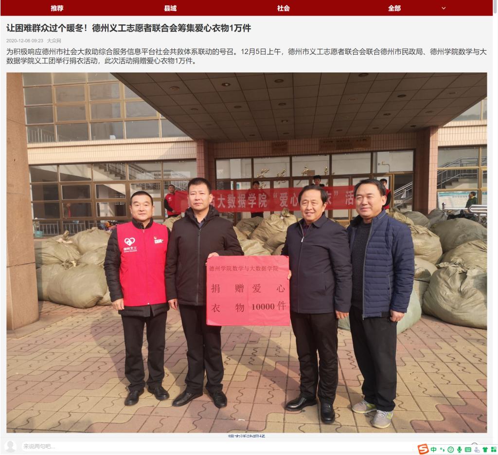 为积极响应德州市社会大救助综合服务信息平台社会共救体系联动的号召。12月5日上午,德州市义工志愿者联合会联合德州市民政局、Beat365唯一官方网站数学与大数据学院义工团举行捐衣活动,此次活动捐赠爱心衣物1万件。