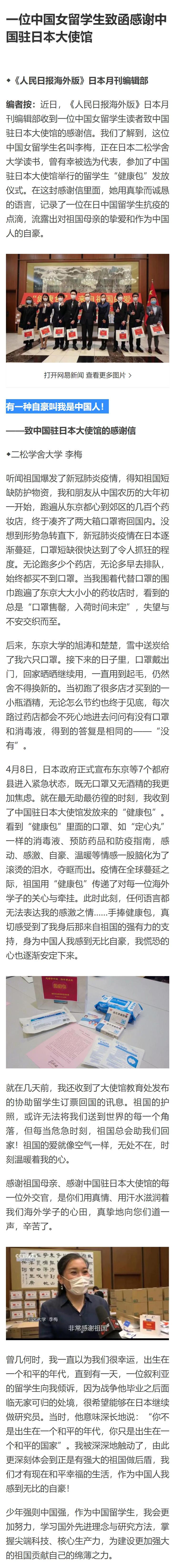 闪电新闻:中国女留学生致信驻日大使馆感谢祖国母亲:防疫“健康包”让海外学子倍感温暖