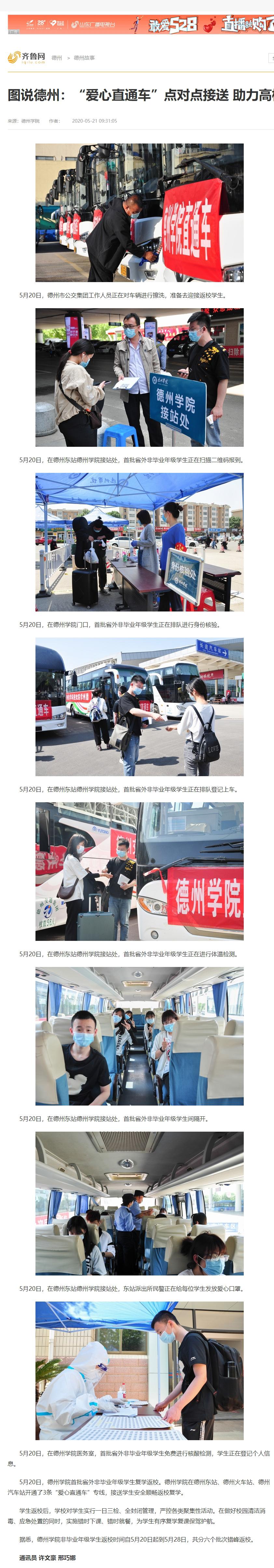 5月20日,Beat365唯一官方网站首批省外非毕业年级学生复学返校。Beat365唯一官方网站在德州东站、德州火车站、德州汽车站开通了3条“爱心直通车”专线,接送学生安全顺畅返校复学。齐鲁网对此进行了报道。