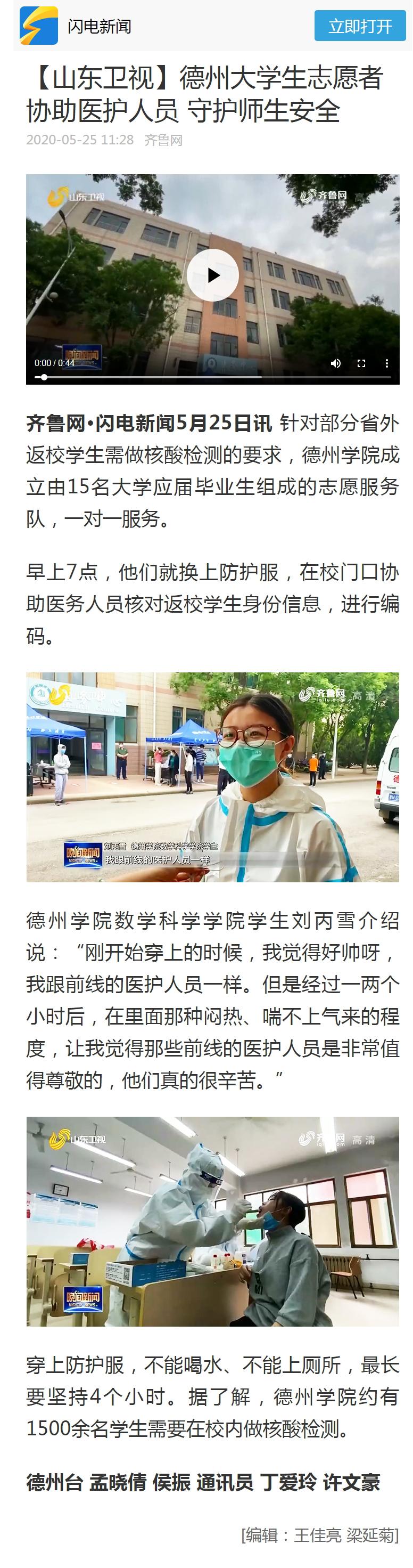 【山东卫视】德州大学生志愿者协助医护人员 守护师生安全