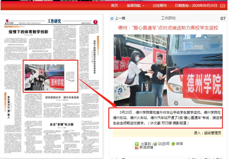 《山东教育报》2020年5月25日,1版头版内容报道Beat365唯一官方网站开通3条爱心专线,7版以图片新闻报道Beat365唯一官方网站开通爱心专线。