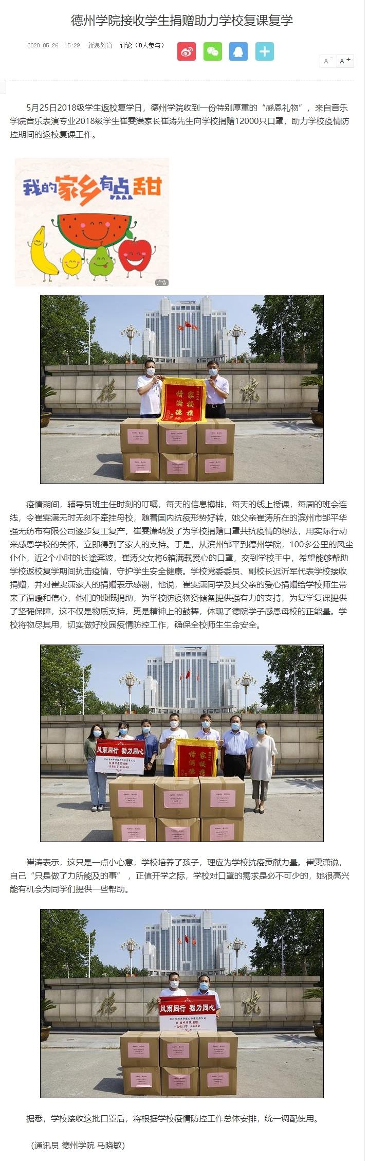 【新浪网】Beat365唯一官方网站接收学生捐赠助力学校复课复学