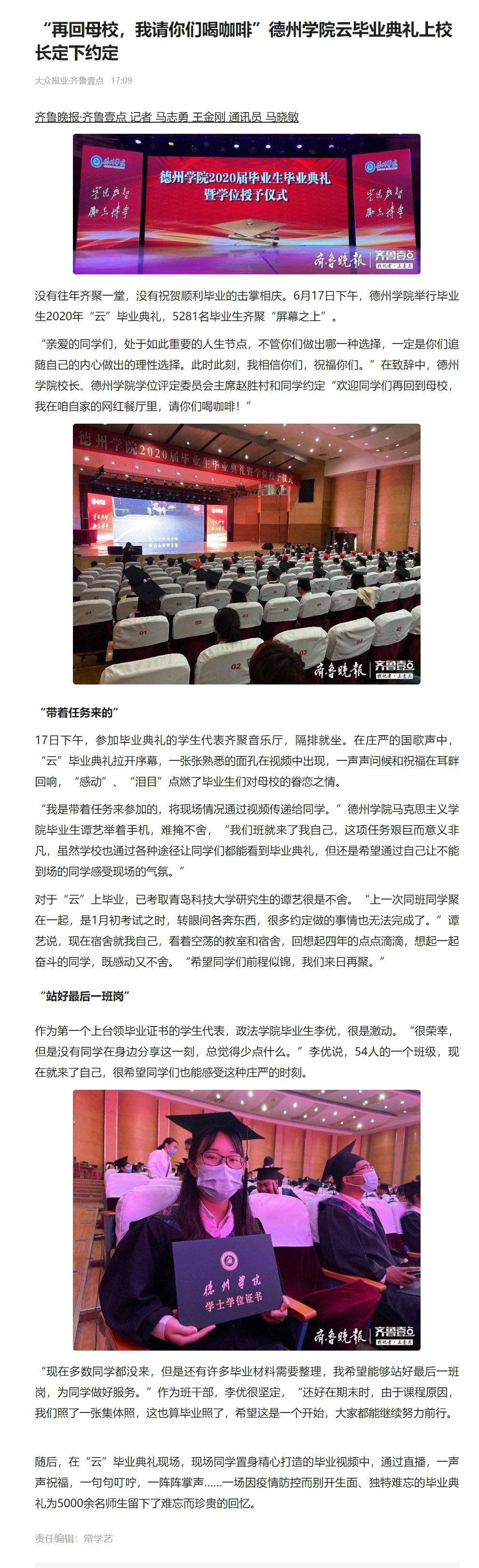 【齐鲁晚报 齐鲁壹点】“再回母校,我请你们喝咖啡”Beat365唯一官方网站云毕业典礼上校长定下约定
