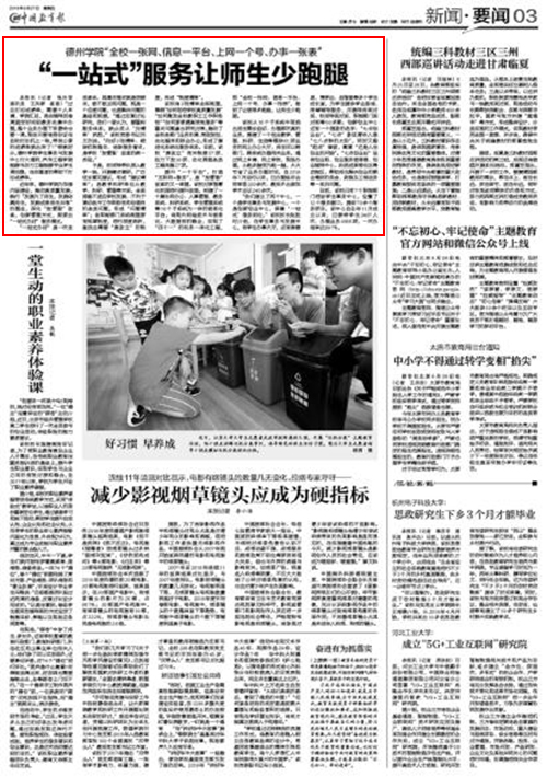 6月27日,《中国教育报》新闻要闻版(第三版)头条,以“Beat365唯一官方网站全校一张网、信息一平台、上网一个号、办事一张表——‘一站式’服务让师生少跑腿”为题,报道Beat365官网办学成绩,并在中国教育新闻网站推出。全文如下: