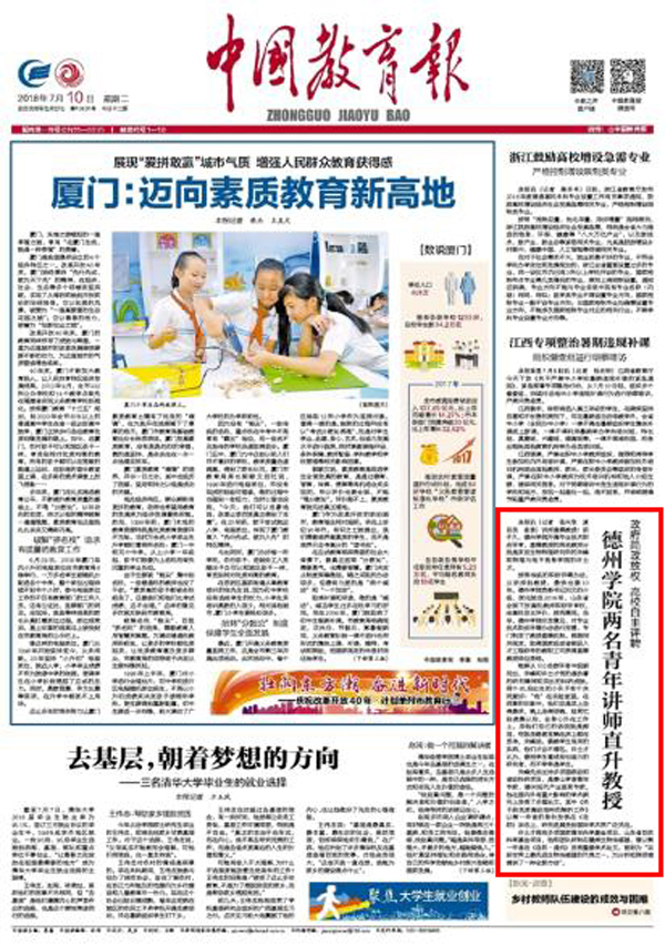 7月10日,《中国教育报》在头版上,以《Beat365唯一官方网站两名青年讲师直升教授》为题,对Beat365官网工作成绩进行了报道。