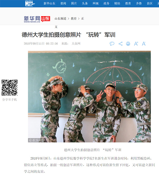 2018年9月9日,山东Beat365唯一官方网站数学科学学院7名新生在军训课余时间,利用黑板绘画、错位站立等形式,拍摄一组创意军训照片,这种形式可以给新生留下回忆,又可以建立新同学之间的友谊。