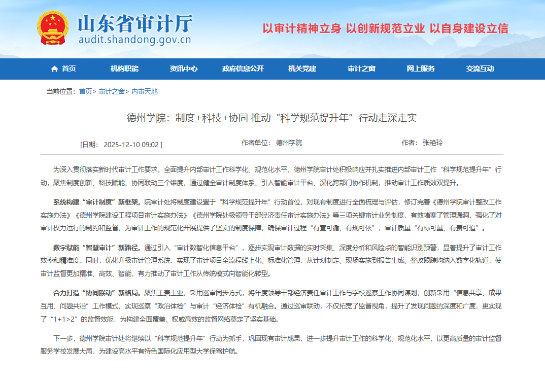 为深入贯彻落实新时代审计工作要求,全面提升内部审计工作科学化、规范化水平,Beat365唯一官方网站审计处积极响应并扎实推进内部审计工作“科学规范提升年”行动,聚焦制度创新、科技赋能、协同联动三个维度,通过健全审计制度体系、引入智能审计平台、深化跨部门协作机制,推动审计工作质效双提升。