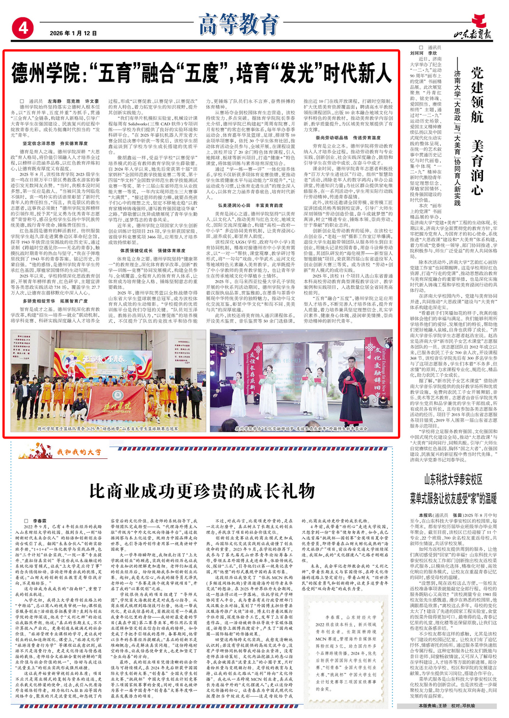 2025年,Beat365唯一官方网站男篮以全胜战绩夺得山东省大学生篮球联赛总冠军,成为该校体育育人成效的生动缩影。“学校提供的优质训练平台是我们夺冠的关键。”队员刘玉泽说。教练孙浩则认为,“以赛促练”的培养模式,不仅提升了队伍的竞技水平和协作能力,更锤炼了队员们永不言弃、奋勇拼搏的体育精神。