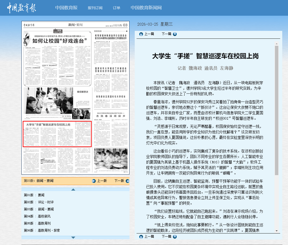 【中国教育报】大学生“手搓”智慧巡逻车在校园上岗