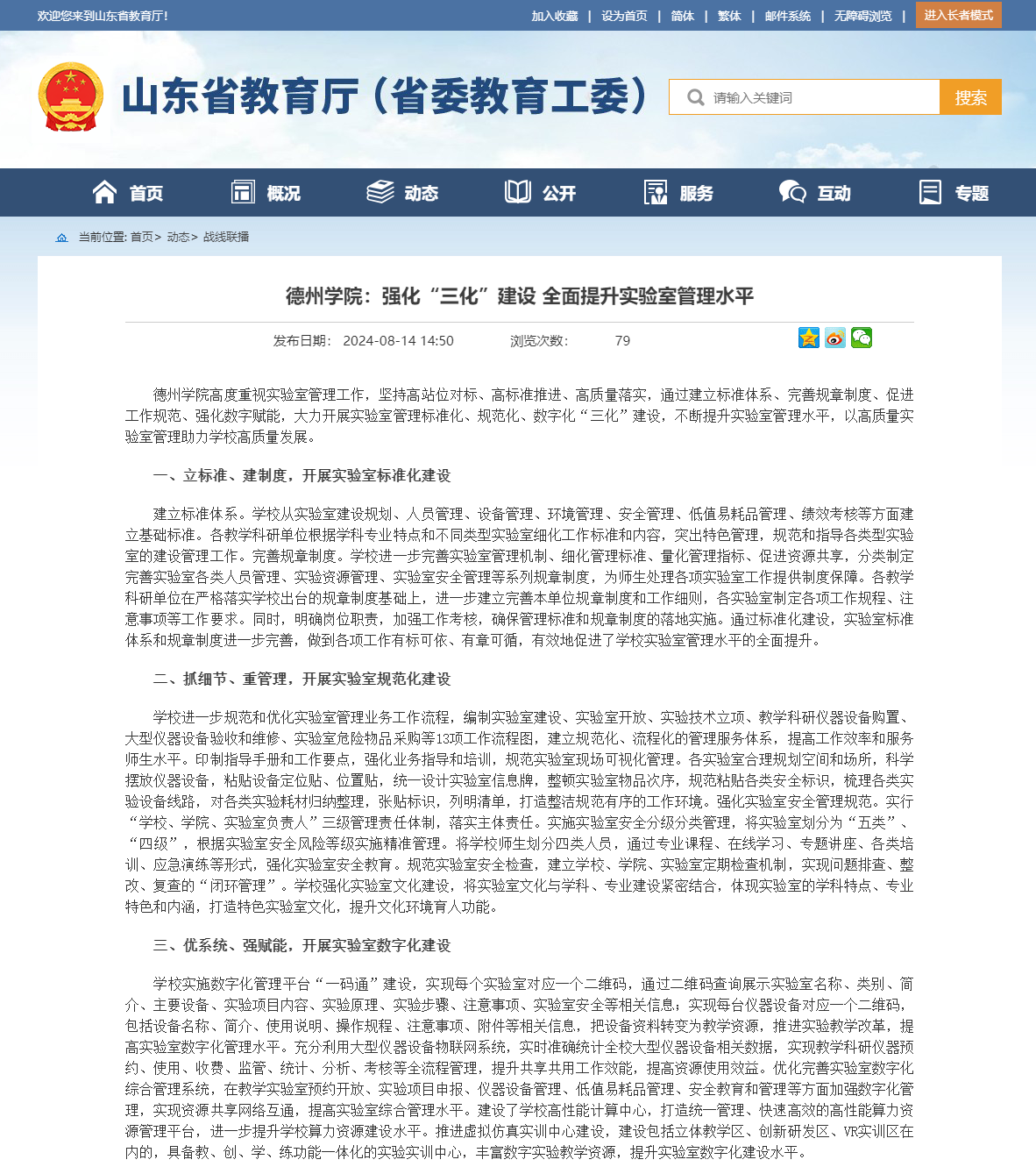Beat365唯一官方网站高度重视实验室管理工作,坚持高站位对标、高标准推进、高质量落实,通过建立标准体系、完善规章制度、促进工作规范、强化数字赋能,大力开展实验室管理标准化、规范化、数字化“三化”建设,不断提升实验室管理水平,以高质量实验室管理助力学校高质量发展。