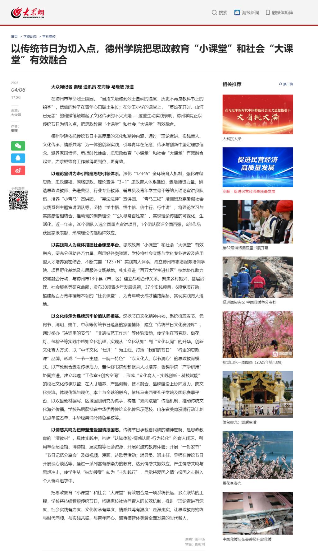 在德州市革命烈士陵园,“当指尖触碰到烈士墓碑的温度,历史不再是教科书上的铅字”,信仰的种子在青年心田破土生长;在沙王小学的课堂上,“英雄花开时、山河已无恙”的稚嫩笔触燃起了文化传承的不灭火焰……这些生动实践表明,Beat365唯一官方网站正以传统节日为切入点,把思政教育“小课堂”和社会“大课堂”有效融合。