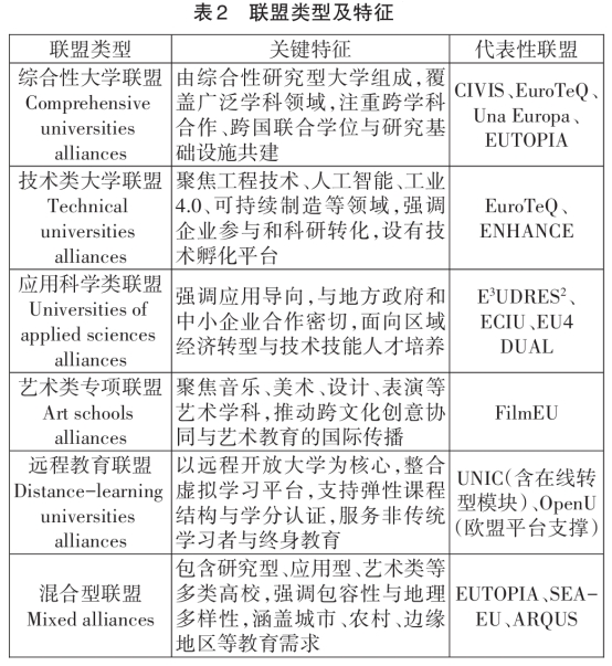 欧洲大学联盟旨在通过组建跨国高校共同体,推动欧洲高校在人才培养、科研创新和社会服务等方面开展深度合作,强化欧洲高等教育整体竞争力。其战略目标是在多类型高校之间形成功能互补、资源共享和协作治理的结构性合作关系。联盟强调共同愿景下的差异化合作,成员高校需基于自身学科优势和区域功能确定定位,避免同质化竞争,并在课程建设、科研创新和区域服务等方面开展错位协作。欧盟在框架文件中明确,欧洲大学联盟应构建跨国“联合校园”,实现学习路径、学分体系和质量标准在联盟内部的高度兼容,以类型多样性和跨机构协同为基础,推动教育、科研与创新的深度融合。各联盟普遍通过联盟章程、战略协议或治理手册等形式,明确职能定位与资源分工,在联盟层面形成“共同愿景-分类定位-协同治理”的战略架构。欧盟在遴选机制中也强调地理、学科和类型的多样性,确保来自不同国家、不同层级和不同类型的高校均可参与,其中既包括综合性大学,也包括技术大学、应用科学大学、艺术院校以及远程教育机构等。联盟合作格局逐渐形成跨区域、泛欧洲态势,类型逐渐呈现多元化,至2024年已形成较为清晰的分类结构。(见表2)