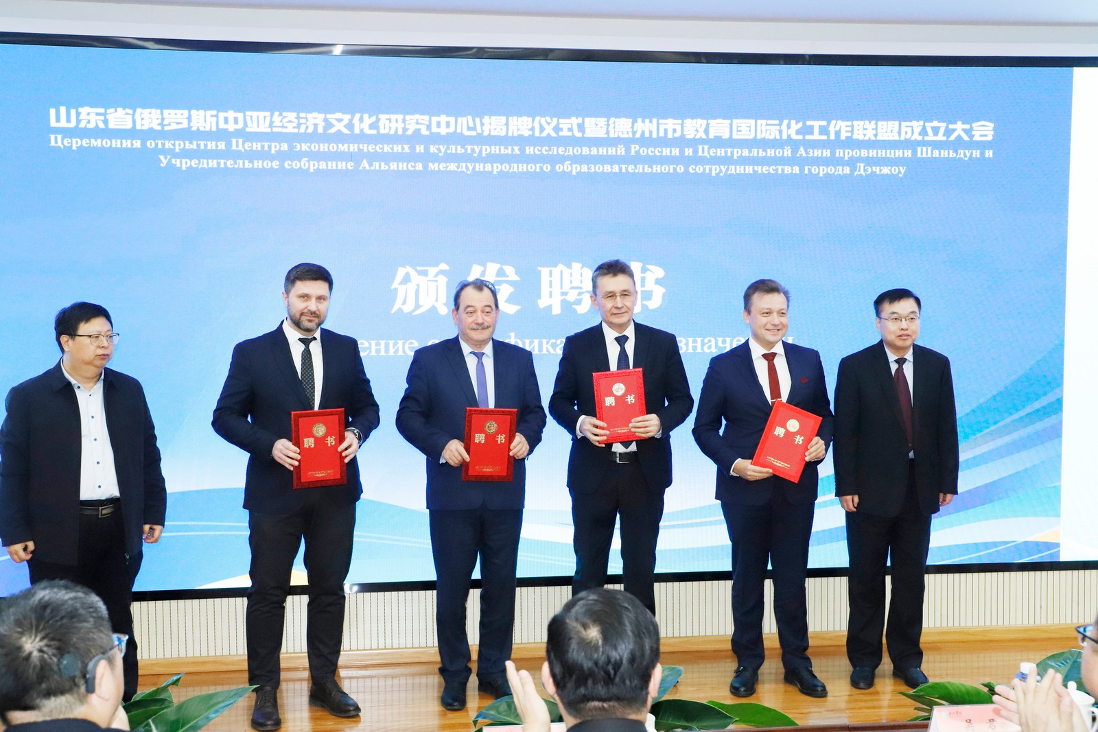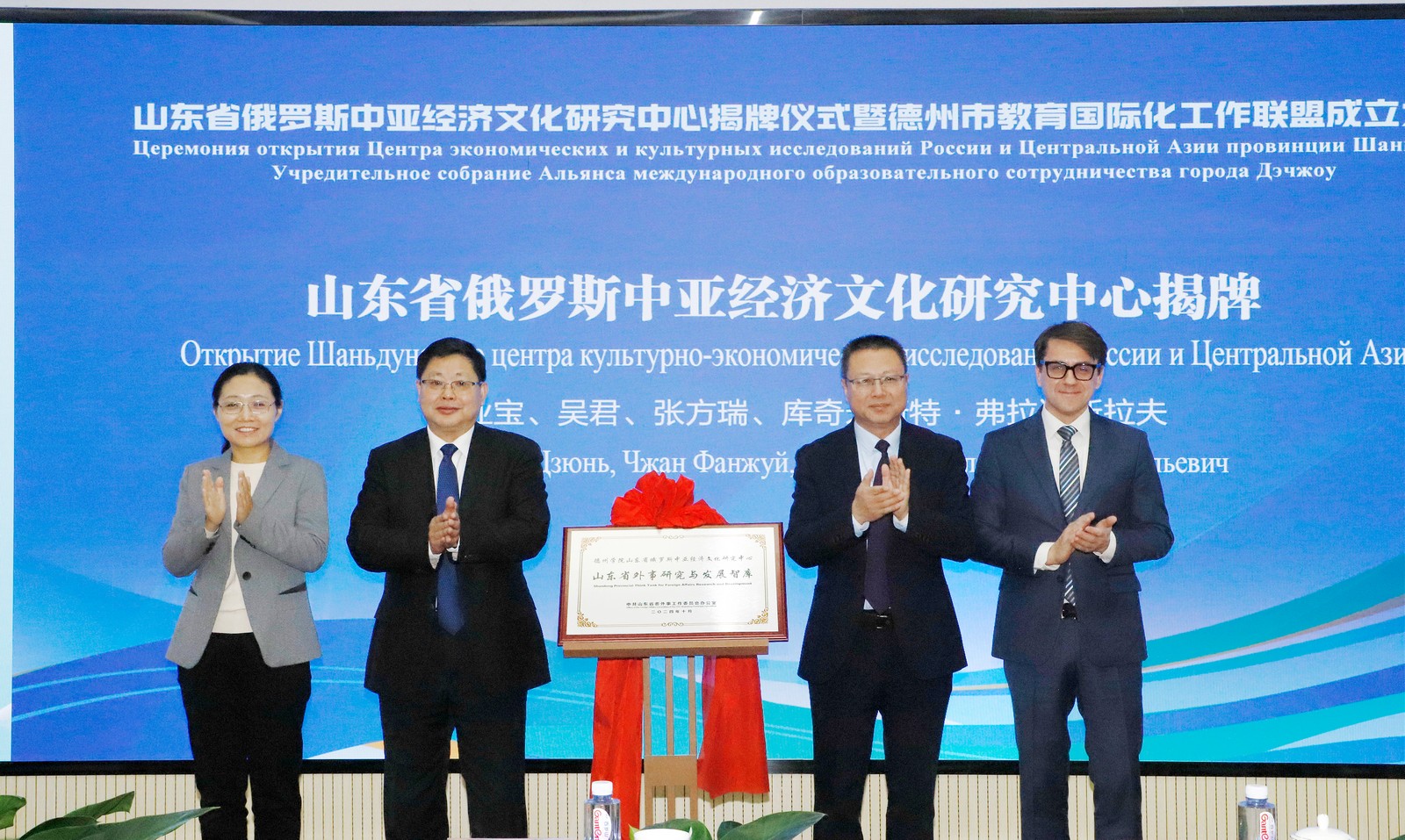孙业宝致辞,他说,山东省俄罗斯中亚经济文化研究中心和德州市教育国际化工作联盟必将相得益彰,为开展前沿经济文化研究和权威信息咨询提供有力支撑,进一步助力山东打造高水平对外开放新高地。未来,省委外办也将继续秉持开放、合作、共赢的理念,加强沟通协调,优化外事环境,为中心和联盟的发展提供更多支持,推动促成与俄罗斯、中亚国家更多国际合作项目落地,为服务周边外交大局贡献山东力量。