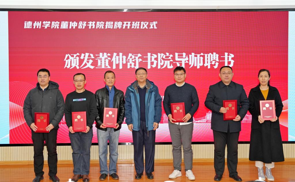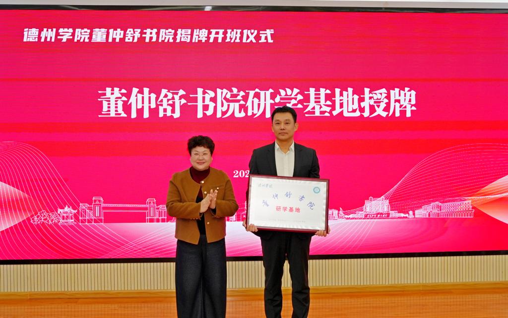 季桂起教授为导师代表颁发聘书;冯琨为德州市董子文化街董仲舒书院研学基地授牌。
