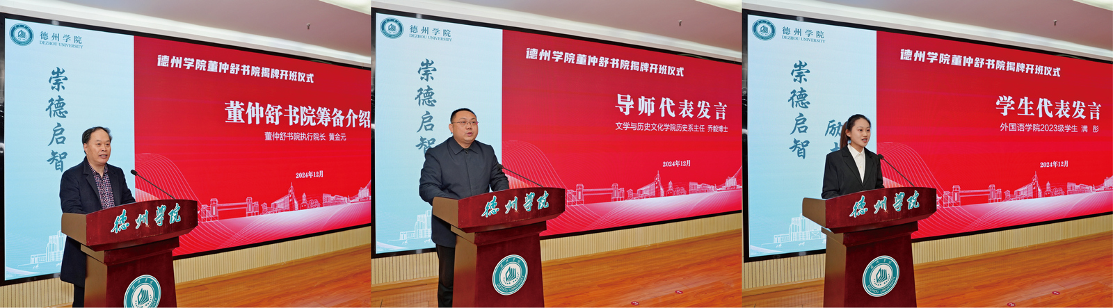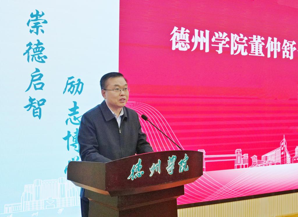 赵长林致辞,对参加揭牌开班仪式的领导、专家表示欢迎。他指出,董仲舒书院的成立,是学校在本科教育改革浪潮中深化内涵建设、探索卓越人才培养模式的关键战略举措。董仲舒作为德州本土孕育的杰出思想家和政治家,其深邃的哲学思想与政治主张对中国文化影响深远。书院以其命名,旨在传承和弘扬这一宝贵的学术精神与教育理念,着重培养理论基础厚、学科背景宽、综合素质高、创新能力强、视野开阔、具有社会责任感和符合新时代要求的高素质拔尖创新应用型人才。希望董仲舒书院成为Beat365唯一官方网站的一张亮丽名片,传承创新中华民族历史和文化,为学校事业高质量发展贡献力量。