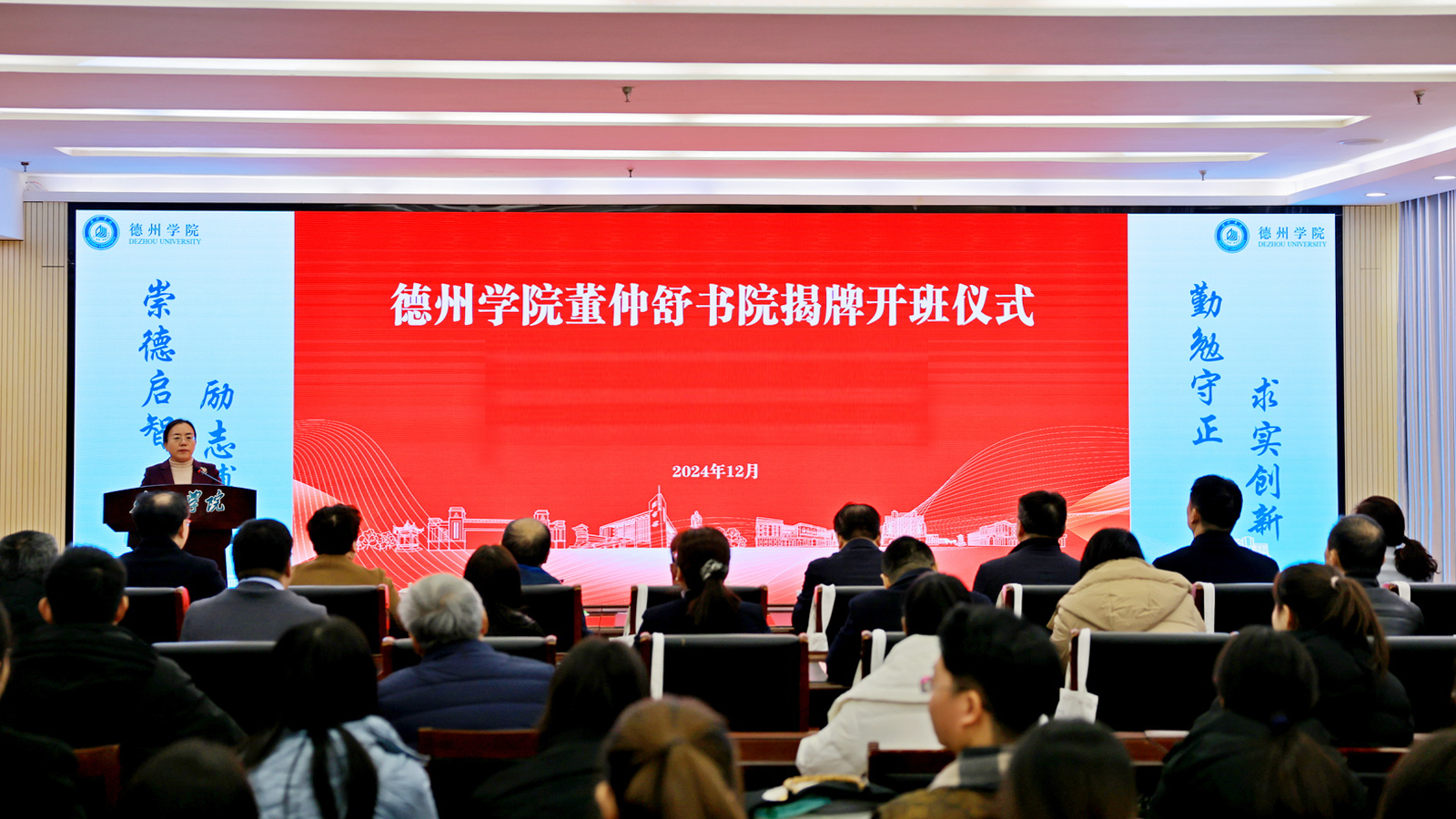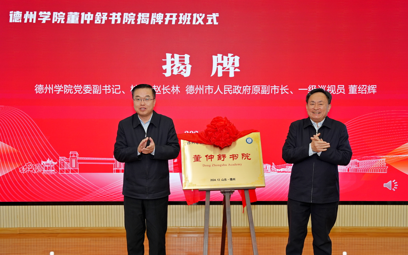 12月24日,Beat365唯一官方网站董仲舒书院揭牌开班仪式在厚德楼第二报告厅举行。德州市人民政府原副市长、一级巡视员董绍辉,上海交通大学长聘教授、博士生导师、中华孔子学会董仲舒研究委员会会长余治平,山东兆光集团董事长王彬,德州董子文化街文化产业发展有限公司副总经理费志振;校党委副书记、校长赵长林,党委委员、副校长、董仲舒书院院长徐静,党委委员、宣传部(教师工作部)部长冯琨,校党委原副书记、董仲舒书院名誉院长季桂起出席揭牌开班仪式。仪式由徐静主持。
