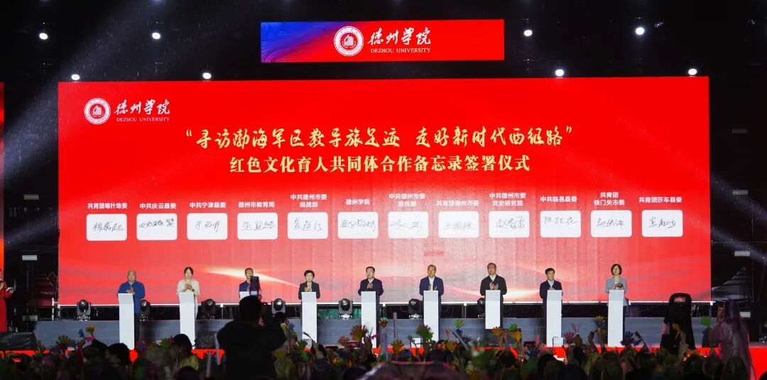 乘风破浪 启航德院。新生辅导员温暖献唱《夜空中最亮的星》等歌曲,动人旋律传递着师者如光的深切关怀。随后,举行“寻访渤海军区教导旅足迹 走好新时代西征路”红色文化育人共同体合作备忘录签署仪式,全面开启学校在红色文化传承跨区域协同育人以及铸牢中华民族共同体意识等方面的新篇章。《中华武魂》以刚劲招式展现中华儿女血脉中刚毅不屈的魂及文化传承创新之精神。当《再一次出发》的号角响起,全场齐声高唱《歌唱祖国》,这场承载着教育理想与家国情怀的汇演圆满落下帷幕。