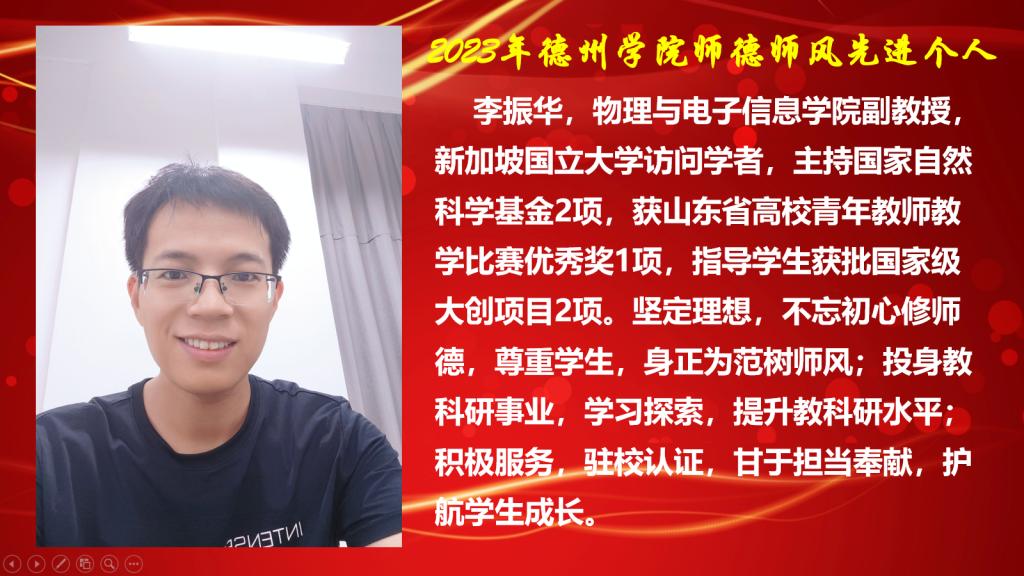 邵丽光,带头培育和践行社会主义核心价值观,模范履行岗位职责,在教育教学、科学研究等方面成绩显著。无违纪、无师德师风问题。近3年年度考核2次“合格”,1次“优秀”。一是开拓创新,做好教学工作。近三年来承担中国古代文学课程的教学工作。在教学过程中积极探索项目教学与案例教学,注重融合课程思政。获得Beat365唯一官方网站校级教学比赛三等奖1项。获得山东省2023年职工教育课题1项。在德州市第九中学挂职6个月。按照师范专业认...