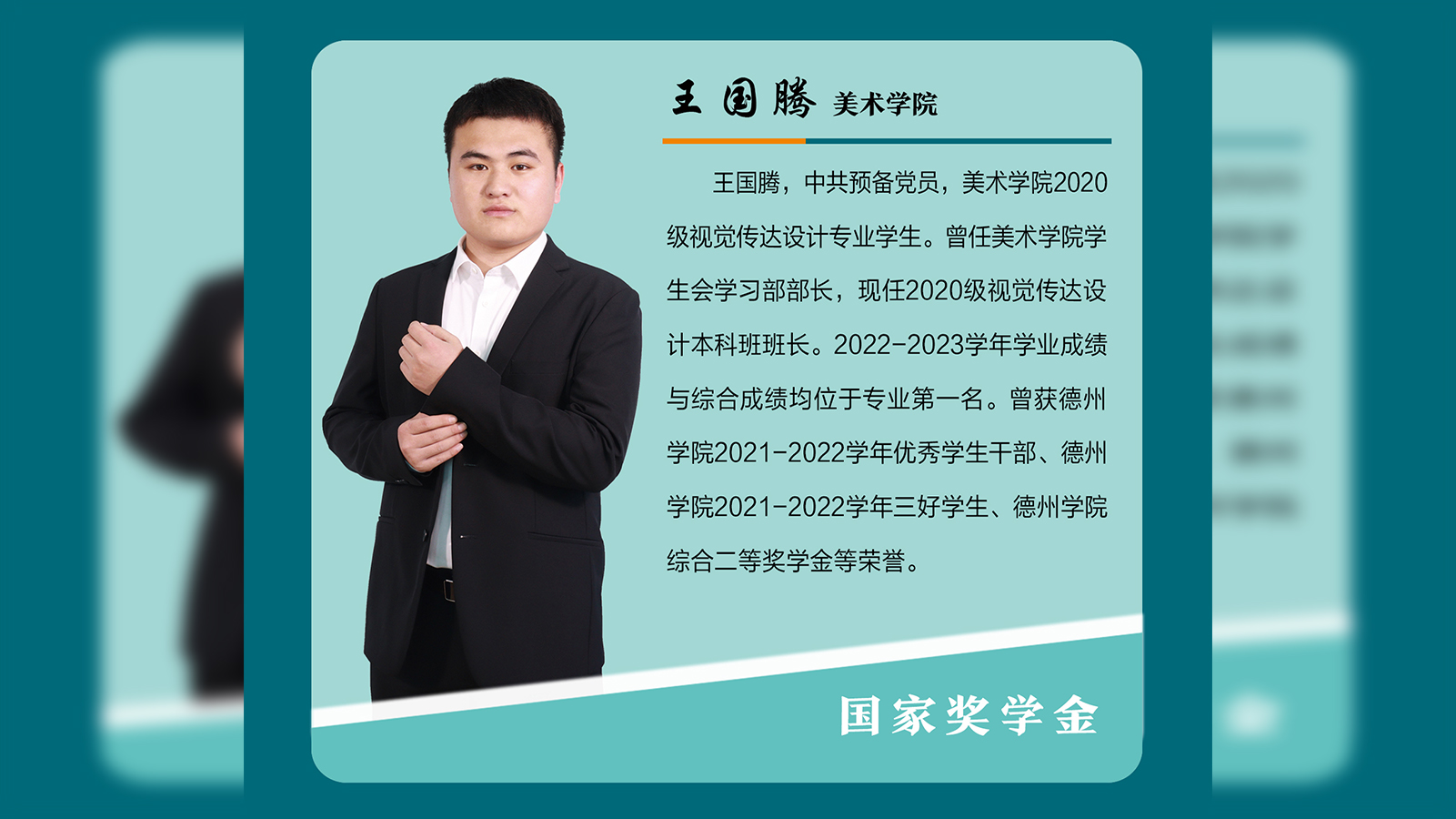 王国腾,中共预备党员,美术学院2020级视觉传达设计专业学生。曾任美术学院学生会学习部部长,现任2020级视觉传达设计本科班班长。2022-2023学年学业成绩与综合成绩均位于专业第一名。曾获Beat365唯一官方网站2021-2022学年优秀学生干部、Beat365唯一官方网站2021-2022学年三好学生、Beat365唯一官方网站综合二等奖学金等荣誉。乐于探究,勤奋刻苦知识改变命运,王国腾深知只有努力学习,才能改变自己的命运。于是,在学习上,他一丝不苟的学习态度,勤于钻研的...