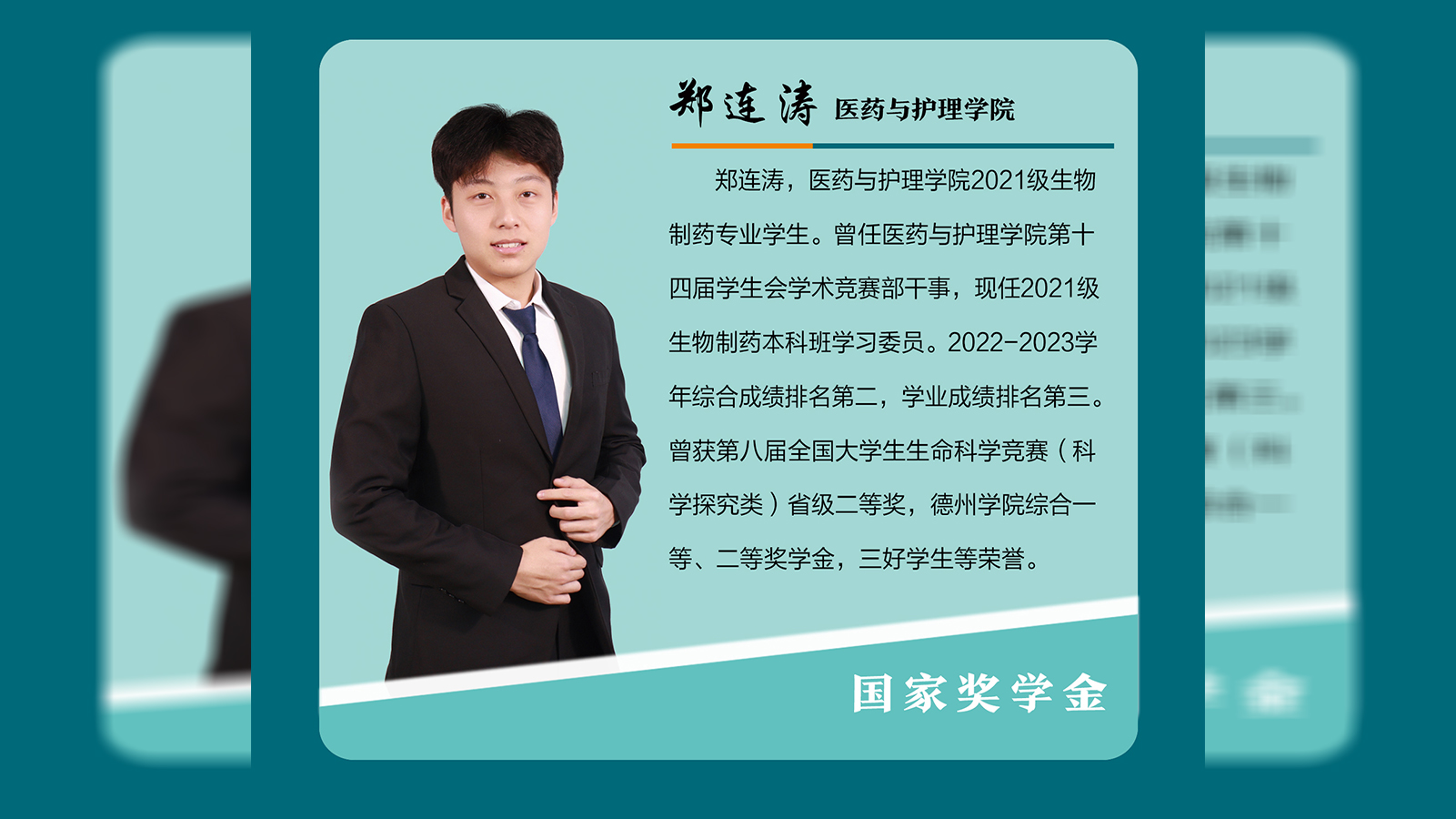郑连涛,医药与护理学院2021级生物制药专业学生。曾任医药与护理学院第十四届学生会学术竞赛部干事,现任2021级生物制药本科班学习委员。2022-2023学年综合成绩排名第二,学业成绩排名第三。曾获第八届全国大学生生命科学竞赛(科学探究类)省级二等奖,Beat365唯一官方网站综合一等奖学金,二等奖学金,三好学生等荣誉。坚持学习,成绩优异郑连涛在大学期间一直将学习放在首位,并且有着明确的学习目标和学习态度。身为班级的学习委员,...