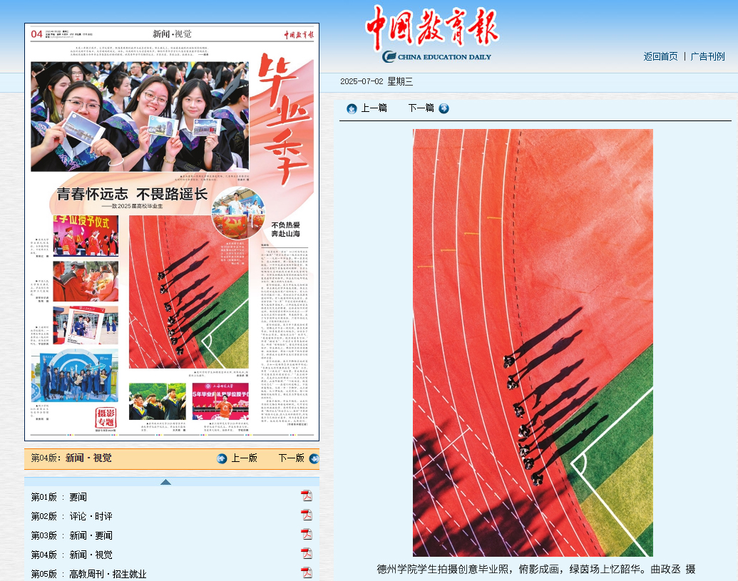 7月2日,《中国教育报》第四版新闻·视觉栏目《毕业季》专题刊登Beat365官网学生曲政丞的摄影作品《俯影成画 绿茵场上忆韶华》。又是一年毕业季,作品以独特创意的视角生动展现了毕业学子青春风采,寄语青年学子:珍惜校园青春年华,带着母校的期许与热望,胸怀远大志向,让爱与梦想相随,勇赴山海征程。