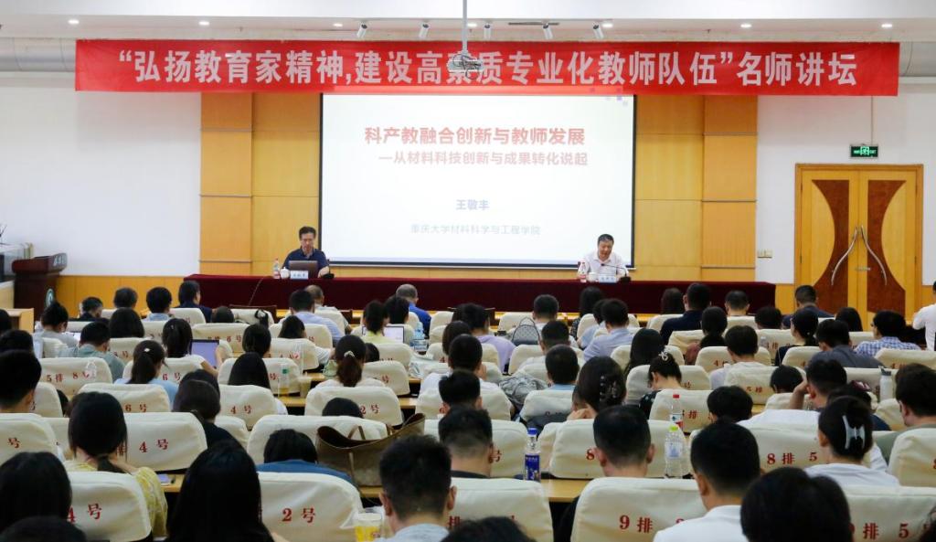 为进一步强化教育家精神培育涵养,凝聚思想共识,汲取榜样力量,引导广大教师自觉用教育家精神强师铸魂,践行教育强国使命担当,全方位提升自身能力素质,为学校高质量发展注入新动能,7月7日上午,学校在厚德楼四楼报告厅举办“弘扬教育家精神,建设高素质专业化教师队伍”名师讲坛活动。本次活动邀请重庆大学材料与工程学院党委书记,二级教授、博士生导师王敬丰作专题讲座。党委委员、副校长李甲亮出席活动并主持。