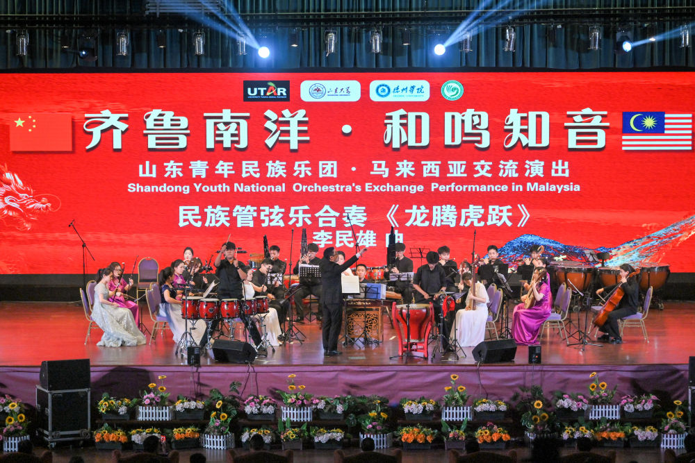 16日晚,“齐鲁南洋·和鸣知音”山东青年民族乐团马来西亚交流演出活动在此举行,来自中马两国三所高校的青年民乐演奏家、歌唱家、舞蹈家与年轻学子相遇舞台,以乐为媒,以曲会友,合奏一场音符跳动、情意共鸣的文艺汇演。