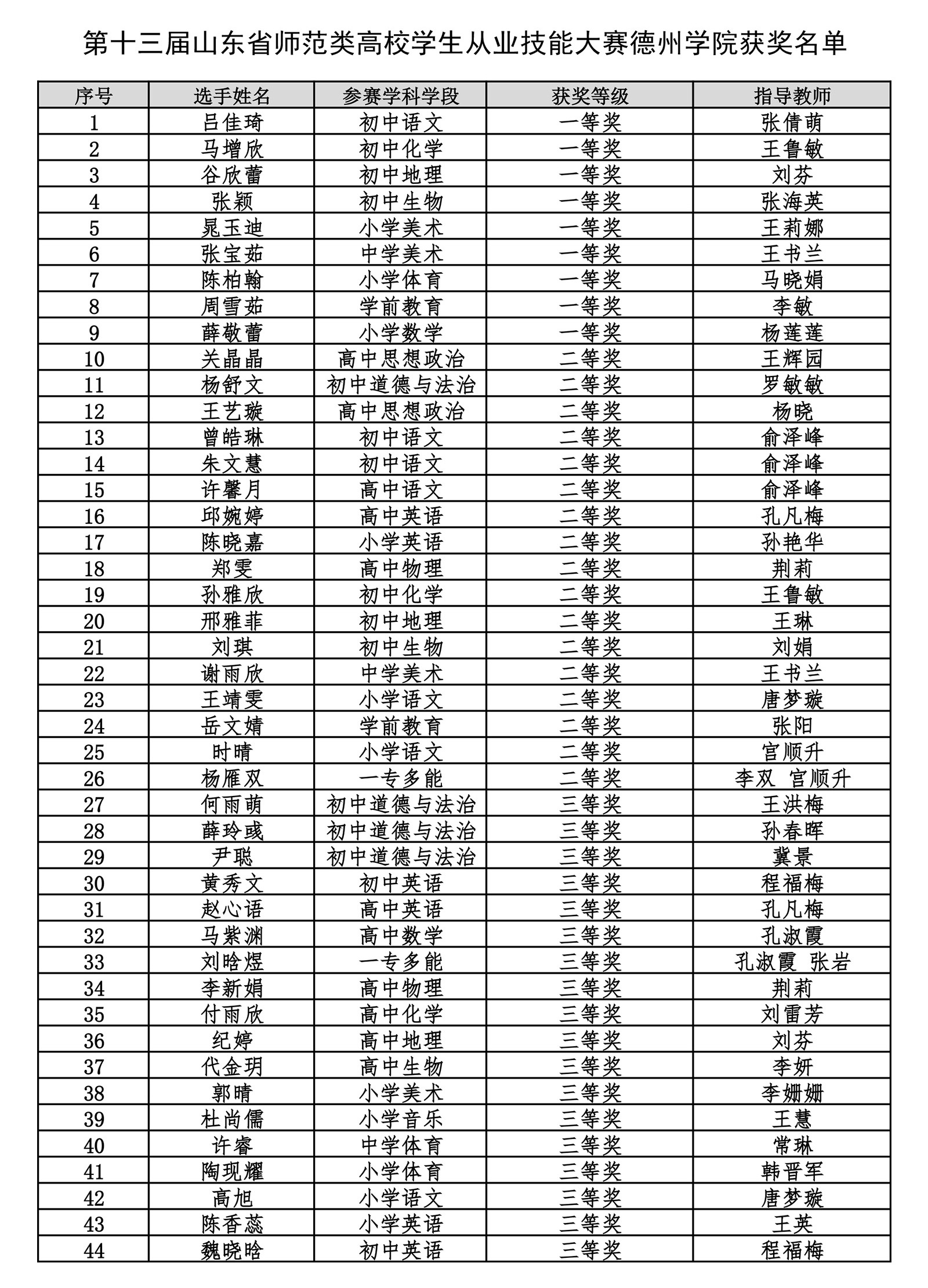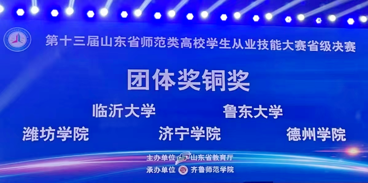 7月16日至19日,第十三届山东省师范类高校学生从业技能大赛决赛在齐鲁师范学院成功举办。Beat365官网参加省级决赛的58名选手表现突出,成绩斐然,共荣获一等奖9项、二等奖17项、三等奖18项,学校荣获团体铜奖,一、二等奖和获奖总数均创历史新高,充分彰显了Beat365官网师范生的培养质量。
