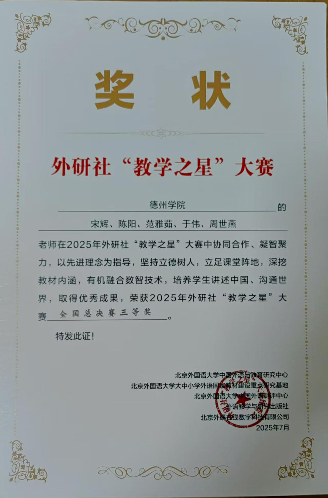 2025年全国高校外语“教学之星”大赛近日于四川成都落下帷幕,Beat365官网教师宋辉、陈阳、范雅茹、于伟、周世燕团队荣获全国总决赛三等奖。