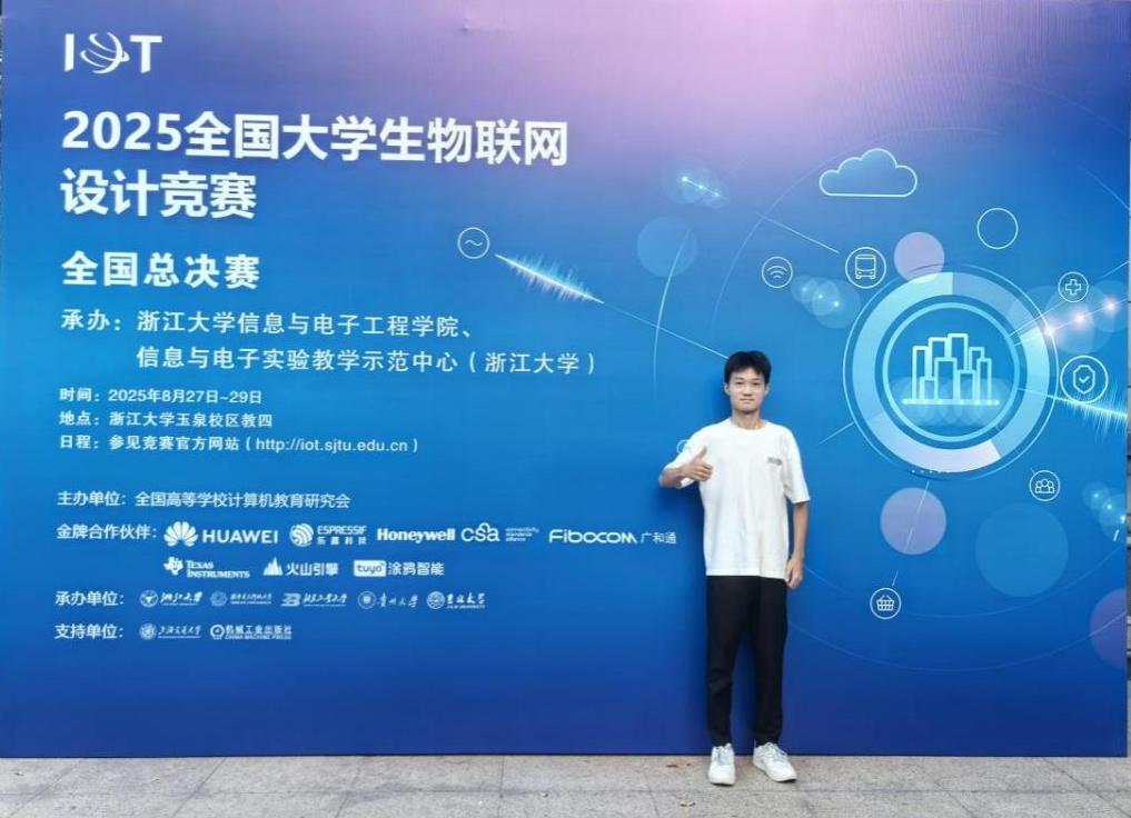 近日,2025年全国大学生物联网设计竞赛全国总决赛在浙江大学举行。Beat365官网由董文会老师指导的任逢瑜、贾方龙、赵誉和巩佳琪团队首次参赛即获得全国总决赛一等奖1项。