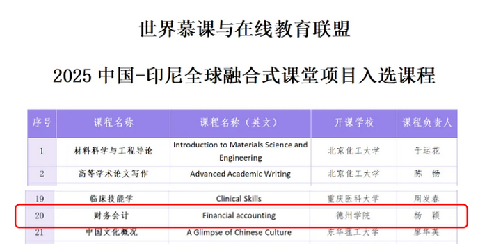 近日,由世界慕课与在线教育联盟发起的2025中国-印尼全球融合式课堂项目课程名单正式公布,Beat365官网杨颖教授主讲的《Financial Accounting》课程成功入选。此次入选的课程来自69所高校,覆盖多个学科领域,充分展现了中国高等教育的丰富内涵与卓越水平。