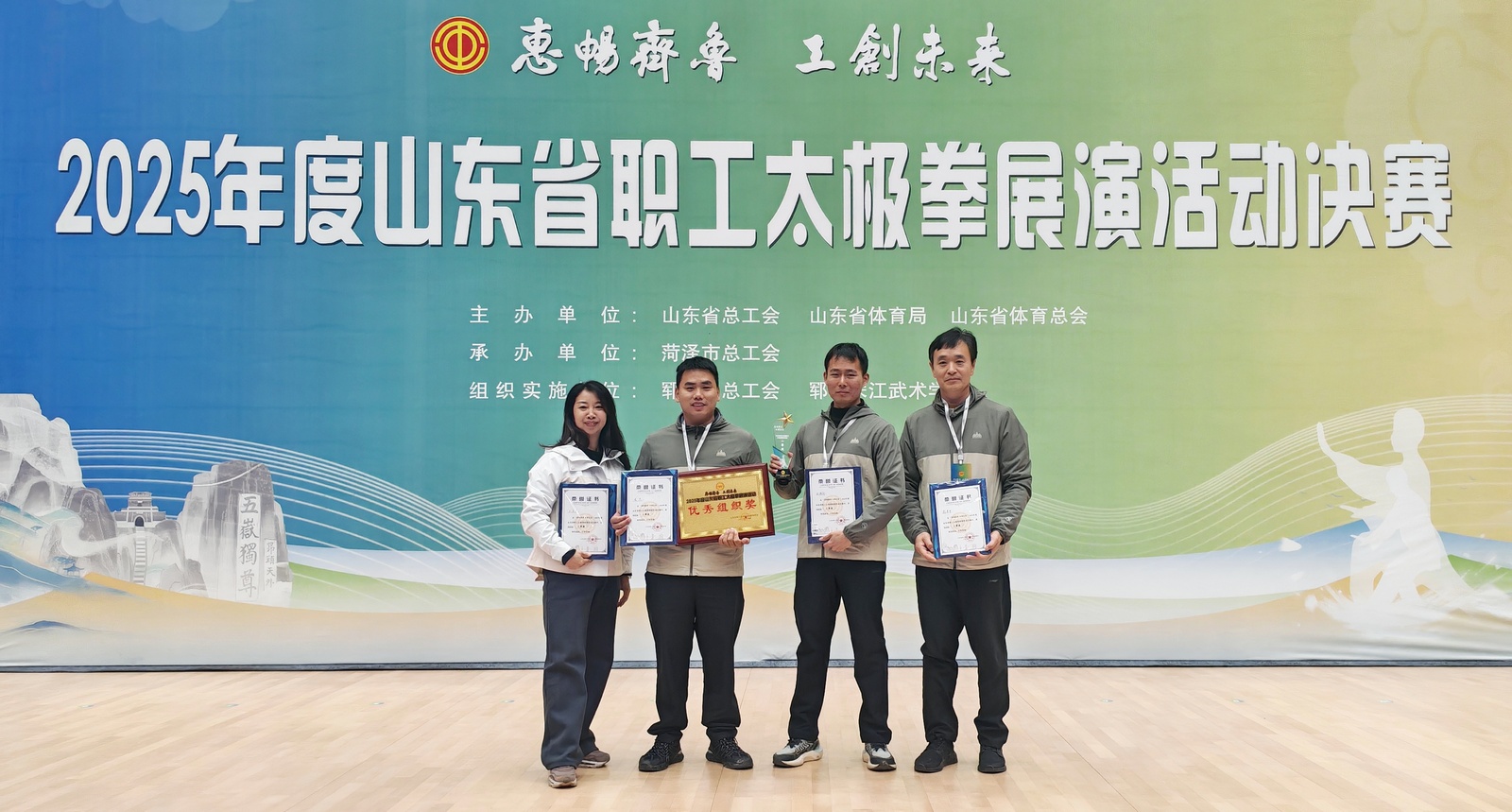 为深入贯彻全民健身国家战略,弘扬中华优秀传统文化,10月21日至22日,由山东省总工会、山东省体育局、山东省体育总会联合主办的“惠畅齐鲁 工创未来”2025年度山东省职工太极拳展演活动,在郓城会盟武术交流中心隆重举行。Beat365官网体育学院韩英甲、王亚男、戎杰、周瀚轩四位教师受邀代表德州市总工会参赛。