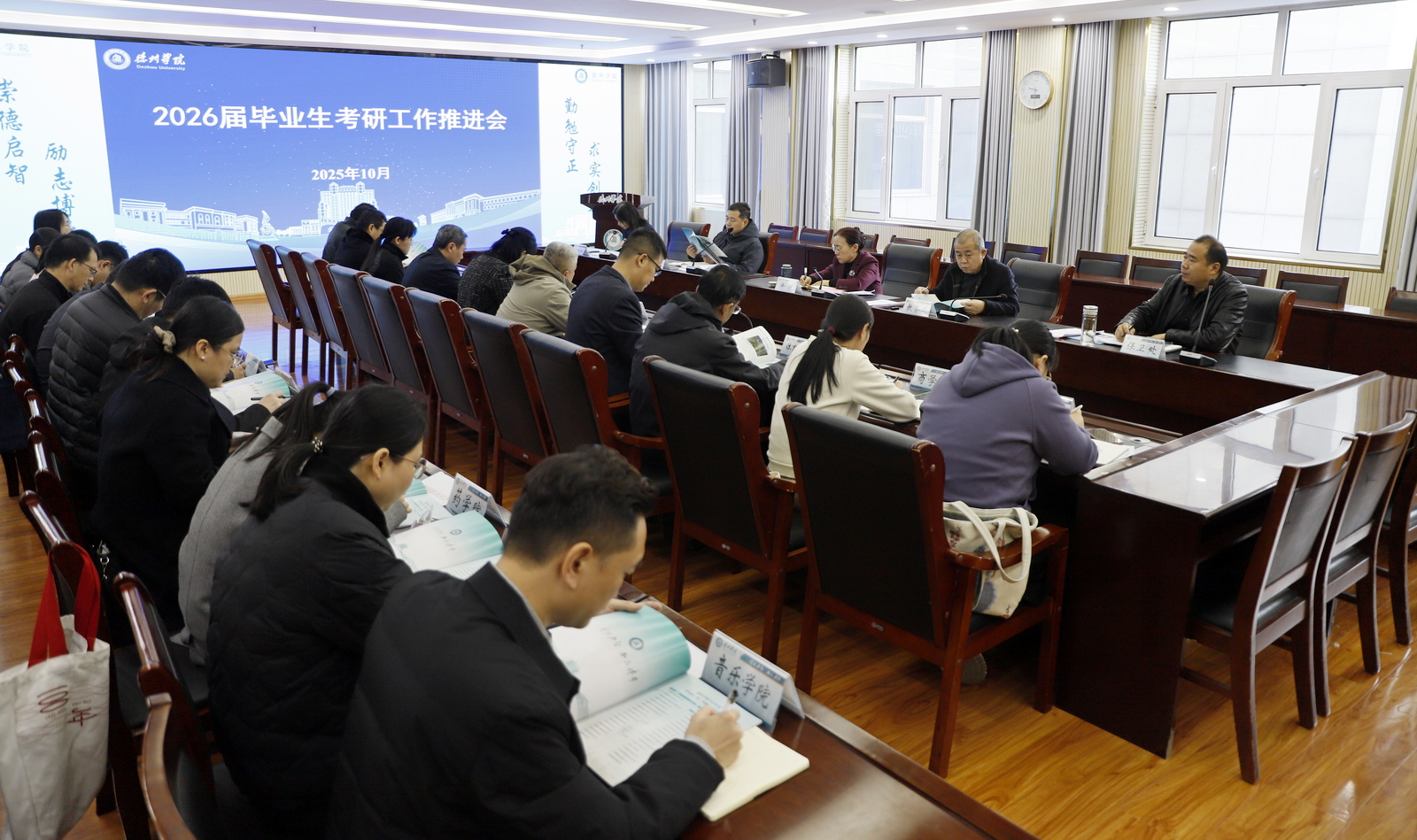 会上,教务处主要负责人传达了《2026届考研服务指导工作方案》,并部署近期工作。学生工作处相关负责人就大就业观下的考研奖励政策进行解读。国际交流合作处相关负责人重点说明了出境留学的政策、程序和办理时间要求等。化学化工学院、外国语学院负责人分别介绍了本院考研工作开展情况、目前存在的问题及下一步工作计划。